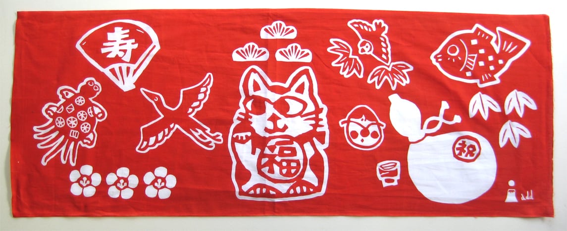 【めでた手拭い】職人の手により昔ながらの技法で染められています。生地は国産の和晒布を使用。どこかなつかしくて新しい、新鮮なデザインの手拭いは、普段使いだけでなく観賞用としてもお楽しみいただけます。